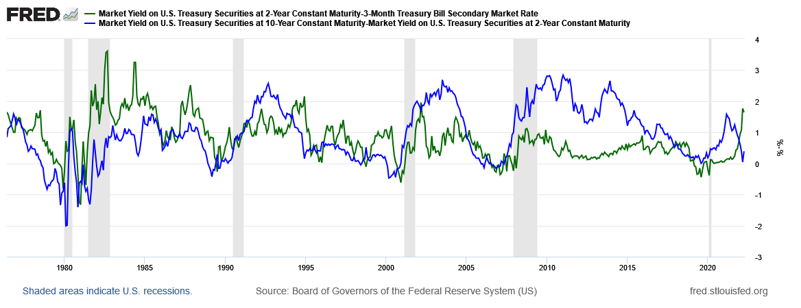 There is a large distance between current Fed funds rate and inflation rate as shown by the chart above.  Can the Fed tame inflation – the stable price mandate – without pushing the economy into a recession?  The Fed thinks they can but the market is less sure.  One popular metric that received much media attention recently was the inverted yield curve.  Inverted yield curve means rates on short-term bonds are higher than long-term bonds.  Historically if the yield curve inverts a recession follows, but not immediately.  The logic is high short-term rates reflect the Fed raising rates significantly but lower longer term rates implies the Fed has to lower rates in the not too distant future, bringing long term rates down.  Some market participants use the 2s/10s curve (10 year minus 2 year rate) but the Fed prefers shorter maturities (I show 2 year minus 3 month treasury bills but the Fed prefers a more accurate implied 3 month rate 18 months from now).  The 2s/10s briefly touched inversion but has since backed off while the shorter curve shape is far away from inversion.  You can also see in the graph below historically the curve inversion occurs well before a recession (grey bars).