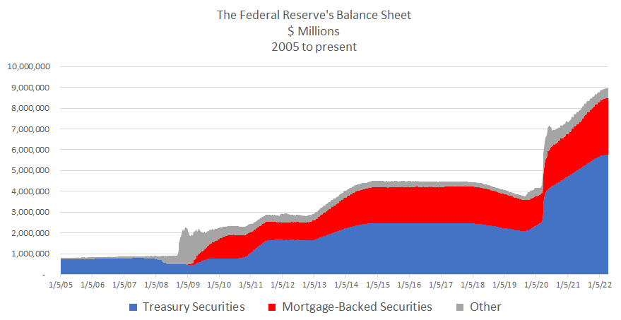 There are many Fed tools available as listed in this link.  The primary tool used by FOMC is the “open market operations”.  In general terms, the FOMC directs the NY Federal Reserve to buy or sell different securities to impact the federal funds rate – which is the interest rate banks lend reserve balances to each other overnight.  This is very closely tied to treasury bills rates.  Before 2008 the open market operations (OMOs) were mostly limited to adjusting reserve balances.  Since the 2008 financial crisis the type of securities traded and the interest rate impacted has expanded significantly, ranging from longer-dated treasury bonds and mortgage-backed securities (which impact long-term interest rates) to repurchase agreements and even currency swaps with other central banks.  The graph below shows the expanded use of the Fed’s balance sheet – growing from $1 trillion before 2008 to just under $9 trillion today – and the different assets now held (Source: American Action Forum).