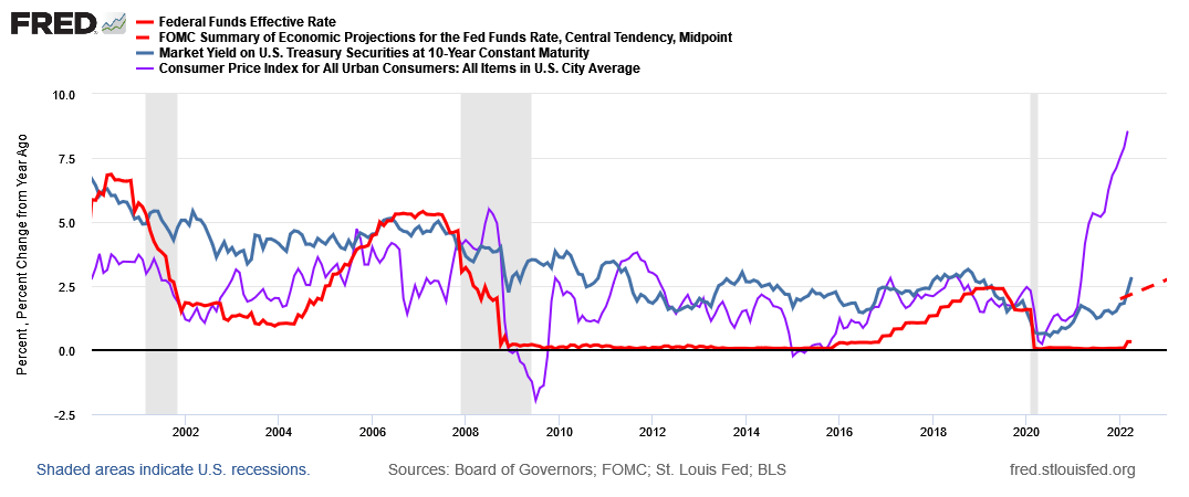 Those are the words found on the website of the Federal Reserve.  This blog post will briefly explain the Federal Reserve, focusing on interest rates and the impact on borrowing costs and investments.  In summary, the Federal Reserve directly controls short-term interest rates (3-month treasury bills, bank savings rates, credit cards) which indirectly - along with many other factors - impact long-term rates (mortgage rates, bond funds… and inflation!).  Short-term rates are going up leading to higher borrowing costs and making risky investments less attractive.
