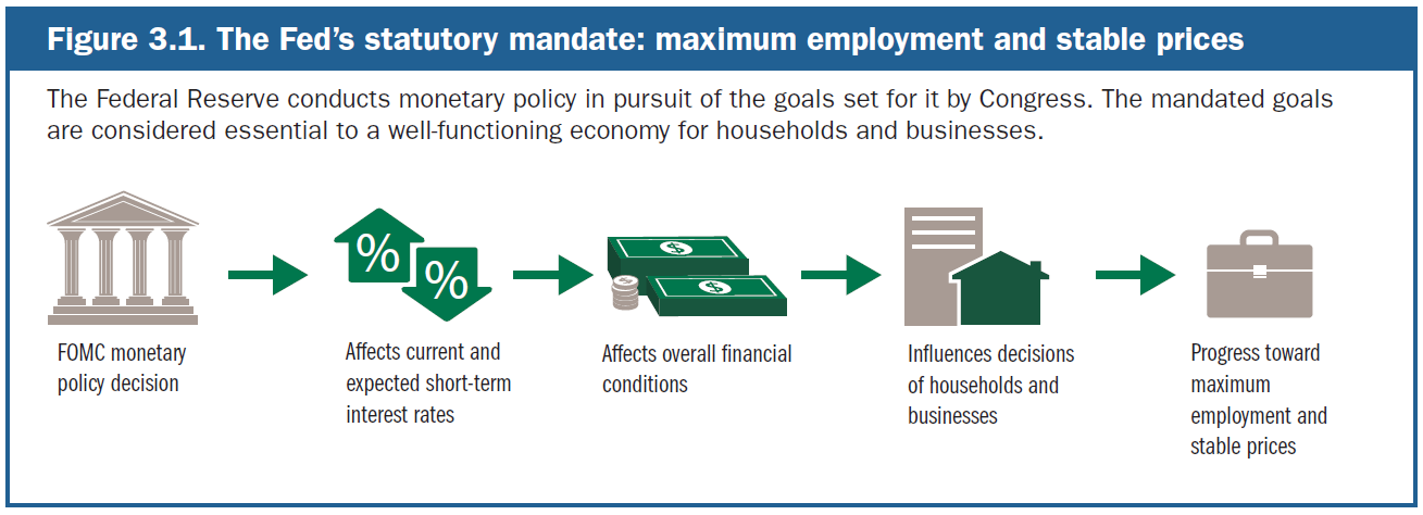 FOMC meetings are scheduled eight times a year.  The economy is discussed and monetary policy decided.  Each meeting concludes with a typical two-page statement succinctly describing the state of the economy and FOMC decision followed by a press conference by the Federal Reserve Chairman (currently Jerome Powell).  At four of these meetings the FOMC also releases its “Summary of Economic Projections”.  This captures the views of all FOMC attendees – voting and non-voting – on GDP growth, unemployment rate, PCE inflation and level of Federal funds interest rate (short-term rates the Fed controls directly).  This last item – projected interest rate levels – is what is commonly referred to as “the dot plot” since each member’s projection is graphed on a plot by year and rate level.  Meetings can also be held as needed, typically during times of financial upheaval, when the FOMC may act between meetings.  The Federal Reserve has a dual mandate – to promote maximum employment and stable prices (see graphic below – Source: The Fed Explained:  What the Central Bank Does).  During normal economic times the FOMC meetings may not get much attention, but that is not the case during times of easing (lowering rates to help employment) or tightening (raising rates to support stable prices, i.e. fight inflation).  It has been stated as the FOMC’s job is to “take away the punchbowl” just as the party is about to get out of hand.