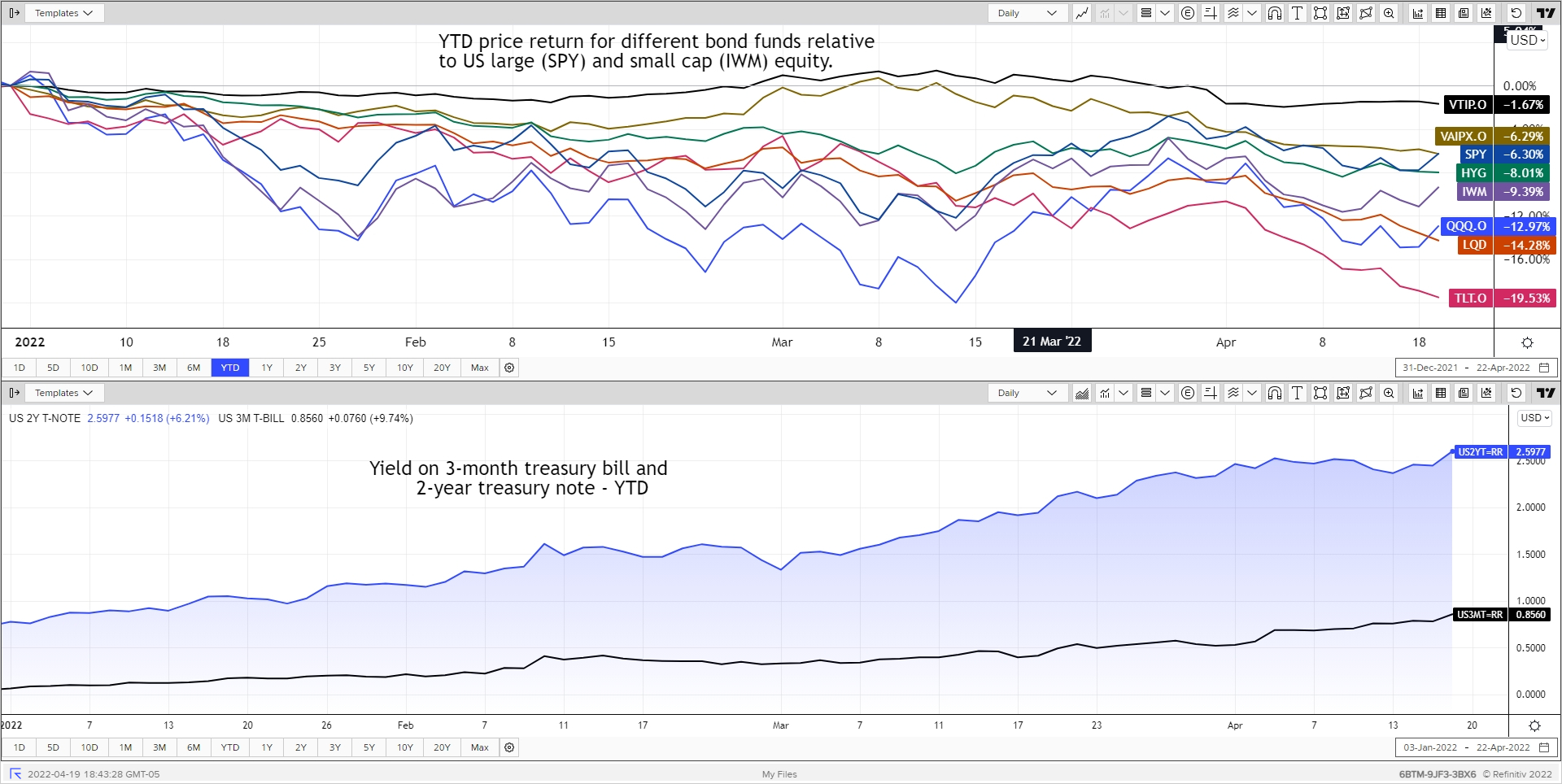 The graph below show YTD price returns for different bond funds along with equity indices.  The two worst performers are longer duration bond funds with Nasdaq QQQ coming in third worst.  This is an example of the market pricing in expectations.