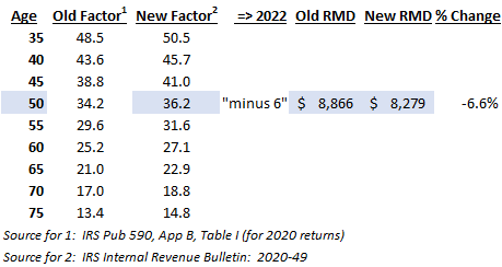 Under the new IRS tables, you must go back and find the new factor based on your age the year following owner’s death, then reduce that factor by 1 each year leading up to 2022 for this year’s factor. Following years will continue to reduce the factor by 1 each year. Using the old and new tables below, if your IRA balance at 12/31/2021 was $250,000 and assume you turned 50 in 2016, the year following the death of IRA owner (and at least 10 years younger than IRA owner) your factor for 2022 will be 36.2 – 6 = 30.2 resulting in an RMD of $250,000 / 30.2 = $8,279 rather than $8,866 under the old tables (6.6% reduction).