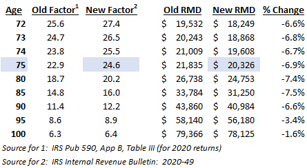 On to the calculations. The table below summarizes the factor from the old and new IRS tables. The RMD amount for a given year is determined by taking the previous year-end Traditional IRA balance divided by this factor. If your Traditional IRA balance at 12/31/2021 was $500,000 and you turn 75 during 2022, your RMD will be $500,000 / 24.6 = $20,326 instead of $21,835 using the old tables (6.9% reduction).