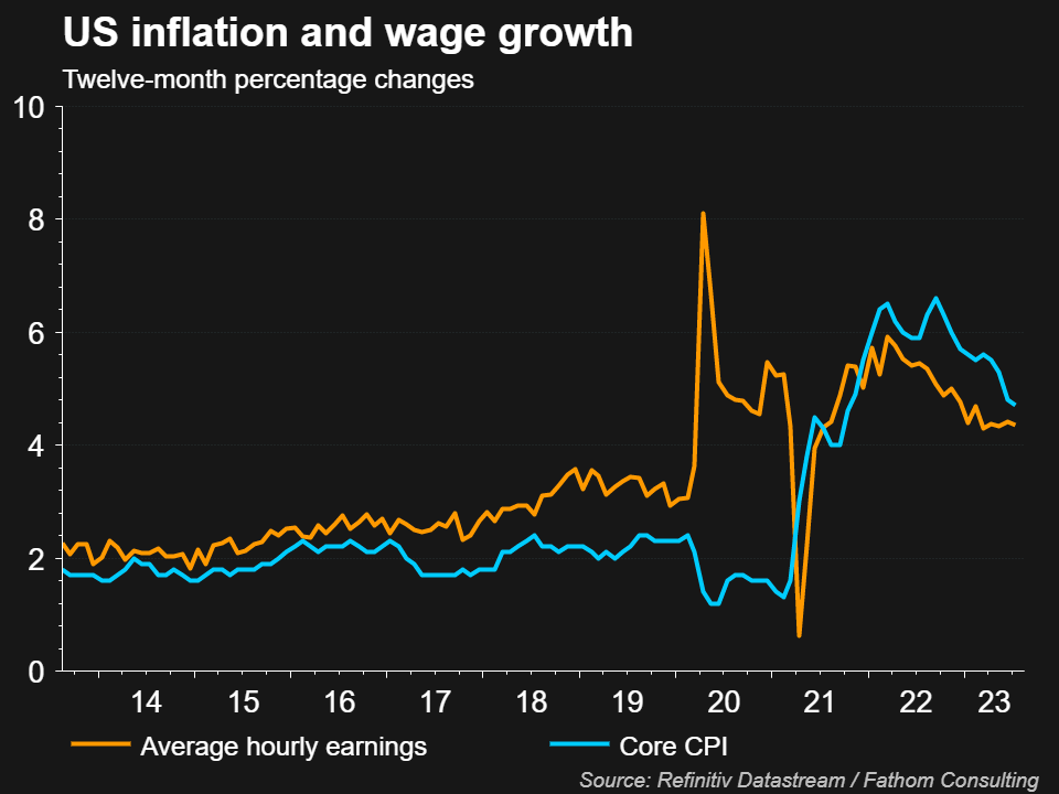 The final graph with a further breakdown involves wages. Earlier I mentioned one mandate of the Federal Reserve is price stability. The other is full employment. That component has been running fairly strong with a very low unemployment rate. This results in higher wages which can keep inflation running higher for longer and allows the Fed to remain restrictive with interest rates. The graph below shows Core CPI (blue) next to average hourly earnings growth (orange). While this is also trending down, it is not nearly as fast as other components.