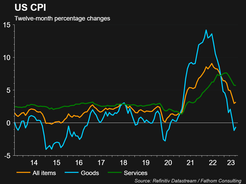 Within CPI, the overall indicator can be broken out by the various components. Another way the view CPI at a high level beyond Core is Goods vs. Services. This has been important the last few years due to disruptions in the supply chain and consumer demand shifting heavily to Goods early on during the pandemic, then later to Services after restrictions were lifted. The graph below compares headline CPI (orange) with Goods CPI (blue) and Services CPI (green). When I first saw this graph about a year ago I was surprised how Services CPI ran so much lower than headline CPI, likely from globalization. While Goods CPI is now back at the lowest reading among the three, perhaps the recent onshoring of production will result in Goods CPI being higher than what we saw the past decade. And the Services component remains quite elevated and sticky, not only from the heavy demand post-pandemic but also picking up more of the wage inflation component since that is a bigger subcomponent over Goods.