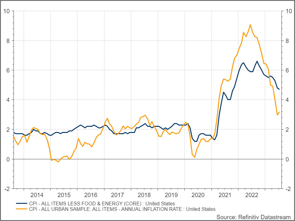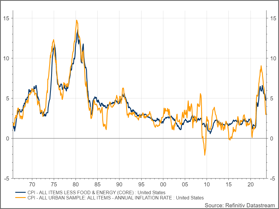 The most common inflation gauge is the Consumer Price Index (CPI) published monthly. There is also a Core CPI which excludes the more volatile Food and Energy components. Yes, we must consume those components, so it is part of the inflation our pocketbooks feel, but it provides economists a more stable and reliable indicator. The two graphs below show both CPI (orange – 3.2% latest) and Core CPI (blue – 4.7% latest). The first goes back to 1965 so you can see where current levels compare to the extreme inflation readings of the ’70s but also how tame inflation has been (especially Core) in the last couple decades. I then show both indicators over the past 10 years for more granularity of the current environment. All future graphs will be based on the past 10 years.