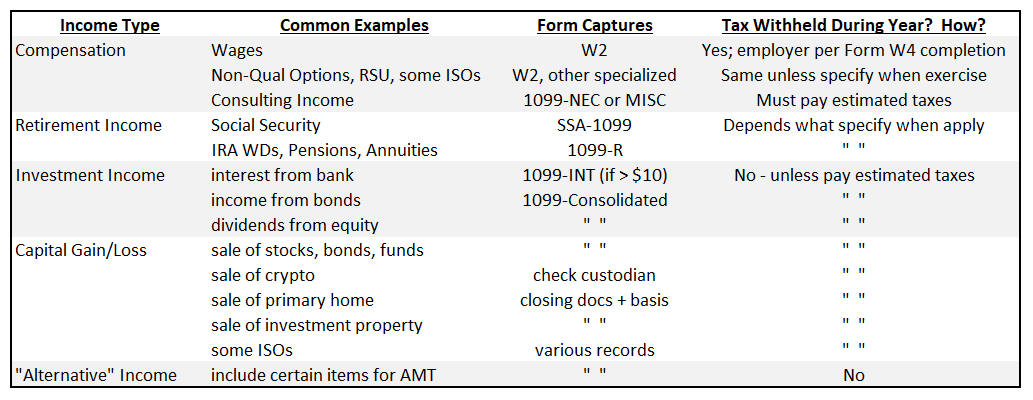 Income can be generated from many different sources. Which tax form captures that income and whether related taxes are withheld during the year are summarized in the following table.