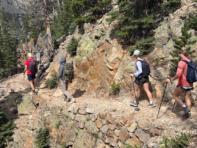 One of my favorite lake hikes is Odessa Lake. The first time I hiked it we kept going to Fern Lake and ultimately a trailhead shuttle bus to get us back to the car. In addition to the beauty, it was mostly downhill. This time we planned to hike back from Odessa Lake rather than going on, which involved a steep climb back up. The “easy button” would have been hiking toward Fern Lake again, or skipping this hike altogether. But I decided to go for it and enjoyed the beautiful views. When it was time to return up the steep trail, I made it back up just fine despite my concerns. Don’t be afraid to try new things even if they seem scary. You will very likely love the views! These photos show us enjoying the lake view along with the steepness of the climb back up. As a quick aside, as I, my kids and godchild hiked, I would occasionally shout “Odessa!” and suggested the kids watch an old SNL skit called “Amazon Echo Silver”.