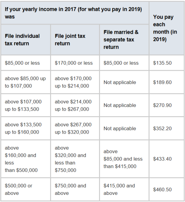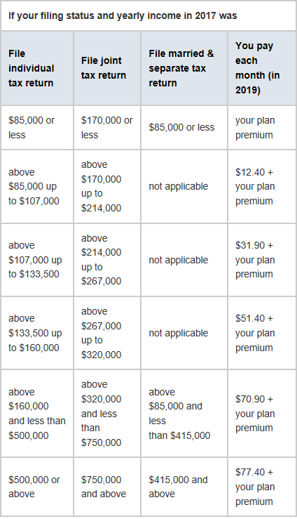 - Medicare Part D (Drug Coverage) is a separate premium that also has a surcharge for higher incomes (see second table above).