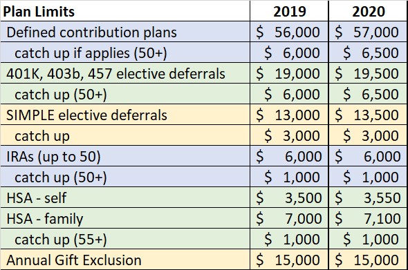 There are limits on the amount one can save in tax qualified accounts like 401(k)’s and IRA’s. For those age 50 and over (55 for HSAs) additional catch-up contributions are allowed. Some accounts also have income-related eligibility or deductibility requirements. The IRS recently published a couple notices updating these contribution limits along with tax bracket amounts and annual gifting exclusions.
