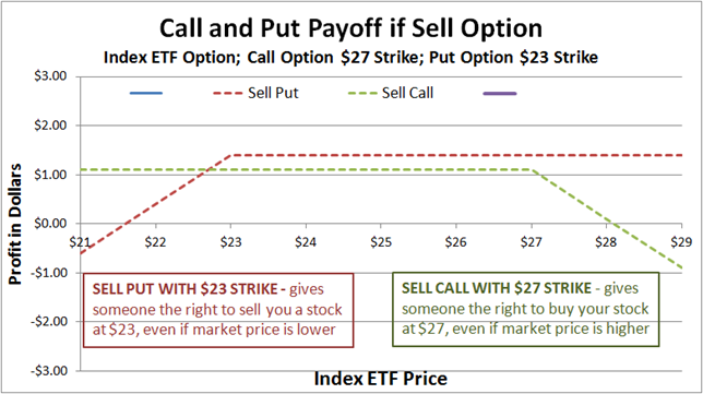 To visualize the payoff for buying a call or put, just flip the graphs and start at negative the premium amounts. If you bought the call, your payoff at expiration is -$1.10 at market prices below $27, hitting $0 at $28.10 and rising from there. At $30 market price for example, the payoff would be $1.90 ($30 minus $27 minus $1.10). If you bought a put, payoff is -$1.40 for prices above $23, hits $0 at $21.60 and goes up from there.