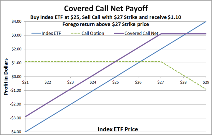 This strategy starts with already owning the underlying stock or ETF as part of a diversified portfolio. Your gain or loss potential can go up or down as the underlying price moves. You could then sell a call option that references this underlying holding (thus “covered”) with a strike price above the current market level and collect the option premium. If the underlying stock or ETF price stays below the strike price you have enhanced the return on the combined holding. However, if the underlying price goes above the strike, you must sell your position at the strike price, even though the market price is higher. The higher the strike price and shorter time to option expiry will result in lower option premium. Using real-time pricing and a robust trading tool or custom-built spreadsheet, one can look at these trade-offs and resulting option premium on an annualized basis to determine best option contract for the investor’s view. Two quick tips - option’s delta is approximately equal to probability of strike being hit at expiration and annualizing option premium is helpful for context.
