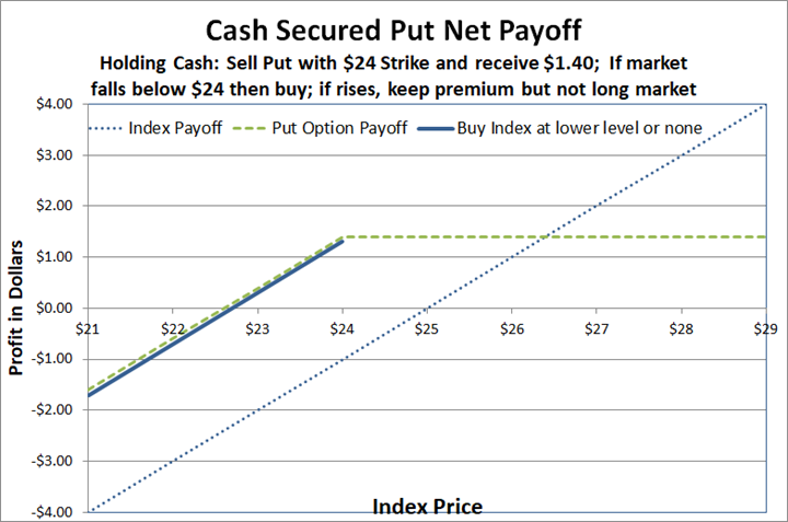 This strategy starts with holding cash and waiting for the price to fall on a stock or ETF before buying. You could just hold the cash in a money market and wait, or sell a put option that references the underlying stock or ETF want to buy at a strike price willing to buy and collect the option premium. Note the cash could not be in a money market if want a true cash-secured put. If the underlying stock or ETF price stays above the strike price you keep the premium but never purchase the stock or ETF. However, if the underlying price goes below the strike, you must buy the stock or ETF at the strike price, even if the market price is lower.