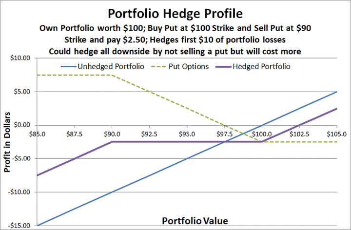 This strategy starts with already owning the underlying stock or ETF as part of a diversified portfolio. Your gain or loss potential can go up or down as the underlying price moves. To protect against losses, you could buy a put option that references this underlying holding with a strike price where you want protection from losses to begin. Since buying the put, you will have to pay the option premium for this protection. If the underlying stock or ETF price falls below the strike price, the put option will protect you against losses below that level. However, if the underlying price stays above the strike, your portfolio will continue to enjoy the upside gains, but portfolio return will be lower by the option premium. One way to reduce the option premium in exchange for less protection is to stop the protection by selling a put option at a lower strike price where protection will stop, using the same underlying and maturity of the option. Adding this extra selling of put (combo called a put spread) requires margin authority and higher level option approval, but is an efficient way to hedge a portion of the downside. You typically set the initial strike maybe 2-5% below current levels and use longer maturity options, depending on your views and potential catalyst for hedging need.
