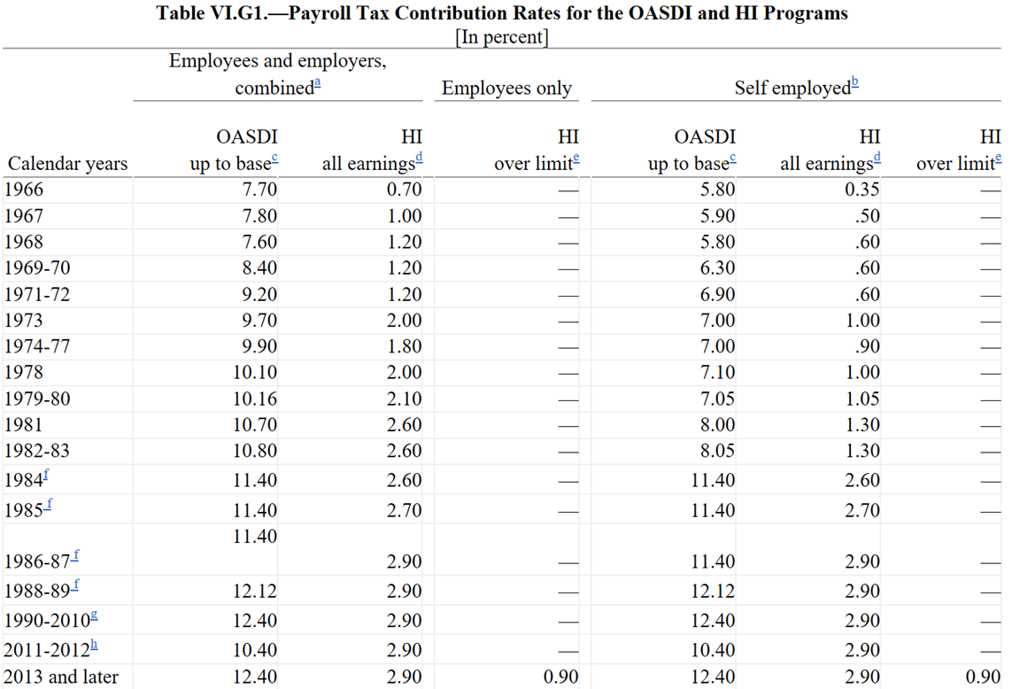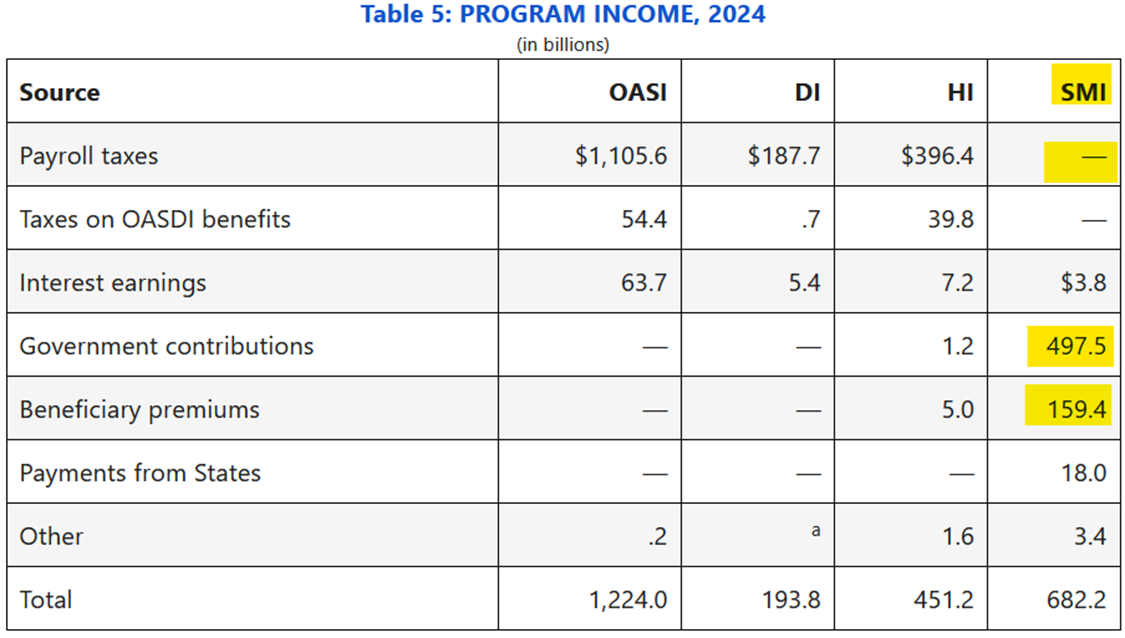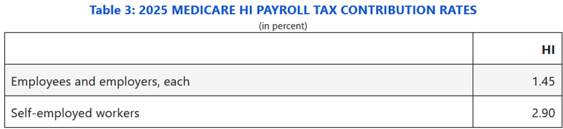 You do – either from payroll tax or general tax revenue, plus direct premiums if on Medicare. Current workers contribute a portion of their paycheck for the three programs in table below - sometimes called “payroll tax” or “FICA tax”. Your employer also pays the same tax; the self-employed pay the full 15.3%. The 6.20% OASDI tax applies to income up to $176,100 (for 2025) but the 1.45% Medicare tax is paid on all income. There is an additional 0.9% Medicare tax for the employee on earnings above $200,000 for individuals and $250,000 for joint filers that started in 2013 to help fund part of Affordable Care Act (not shown in table below). Also note the $200k and $250k is NOT indexed for inflation, catching more workers each year with wage inflation.