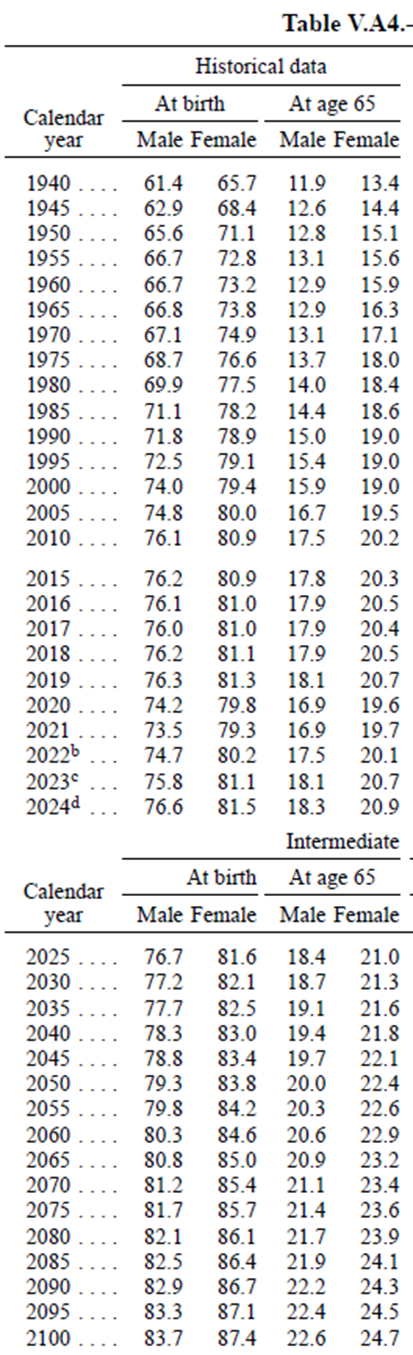 The table below shows life expectancy over time. The first two columns show life expectancy at birth; the last two show the expected remaining life expectancy for those who made it to age 65. Notice the increasing life expectancy, both historically and projections.