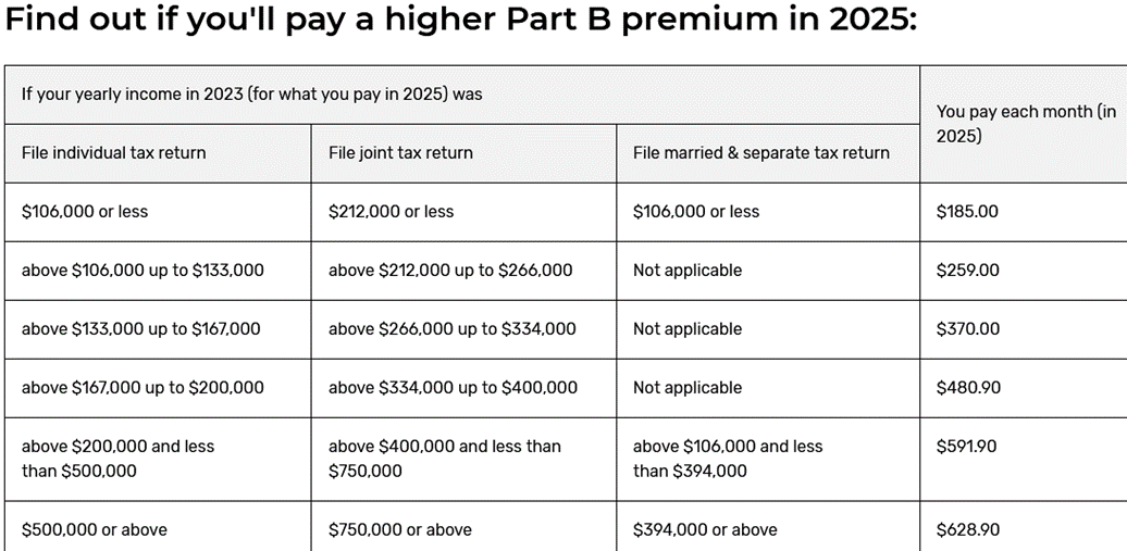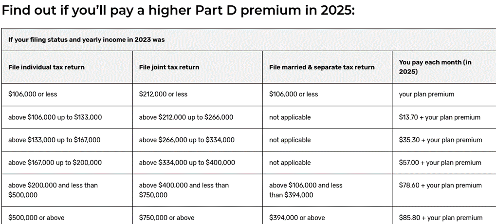 Medicare Part B and Part D is funded primarily from two sources – about 73% comes from general revenue of our generous taxpayers, 23% comes from monthly premiums by retirees and the remaining 4% from other sources. That’s right – the monthly Medicare premiums only covers about 23% of the true cost. Medicare Part B monthly premium = $185.00/month; Part D base premium varies by plan depending on specific drug coverage you select. Additional tiered premiums for Part B and D are required for high income retirees (in 2025 – if Modified Adjusted Gross Income above $106,000 for individual filers; $212,000 for joint filers – more details later).