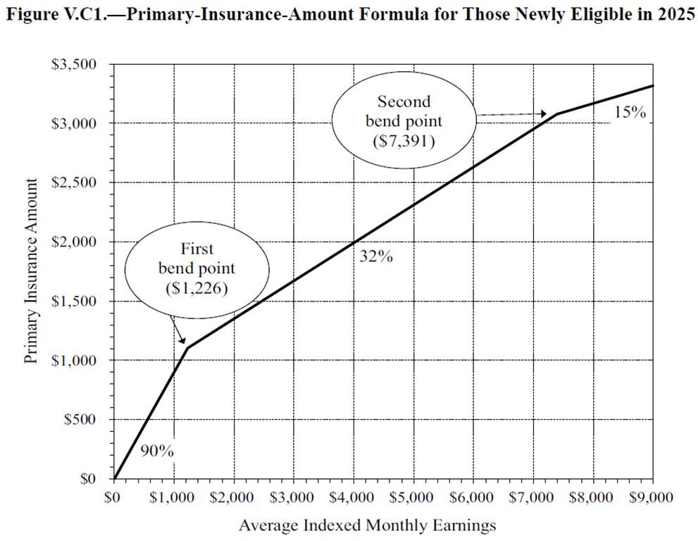 - Social Security uses “bend points” to calculate the benefit received. Everyone pays the same 6.2% FICA tax on income but the amount of benefit paid is based on 90% of first $1,226 in monthly earnings, then 32% on income between $1,226 - $7,391, and finally 15% above. This results in lower income workers receiving a much higher % of their income as a benefit. Keeping with the “social” part of the program and lifting individuals out of poverty makes sense. But it should be recognized that the benefit calculation is already quite progressive (see graph below).