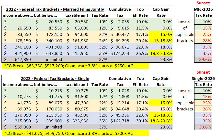 The tax brackets referenced above have an increasing marginal rate based on taxable income (after deductions).  Tax brackets vary by filing type – Single, Married Filing Jointly, Head of Household and Trust.  I only show the first two below but be aware a Trust (if it files own return, not all do) has very tight income brackets and hits the top rate just over $13,000 of income!  Also be aware Congress proposed raising tax rates in 2021 but the bill didn’t pass (top capital gain rate of 28%; tightened thresholds where 35% applies; top rate to 39.6%).  They will likely be at it again in 2022 so monitor and plan accordingly.  If Congress does nothing, tax rates will revert back to 2016 levels starting in 2026 – commonly referred to as the sunset provision.  NOTE:  these are 2022 tax year thresholds to use for planning; your 2021 returns will use last year’s income brackets but same tax rates.