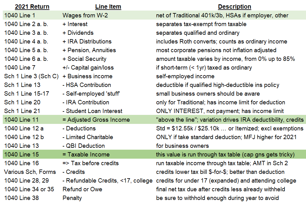 So how does all this come together?  After making your decisions (some implicitly) during the year on withholding forms and income recognition (selling securities, partial Roth conversions, etc.), you gather the data for your accounting service of choice.  There may be a final HSA or IRA contribution for the previous tax year if allowed.  All the data above is run through the tax machinery and summarized on two pages of Form 1040 (with many supporting pages).  You find out if more tax is owed (beyond what already withheld) or get some of own money back.  Adjust your W4 and/or estimated payments if that number is too high in either direction, especially if a penalty!  The table summarizes the key lines of 1040 and Schedule 1 so you can see where the above items drop in.  There are strategies to manage most of these lines - topics for future blog posts or give us a call to discuss how we help our clients.