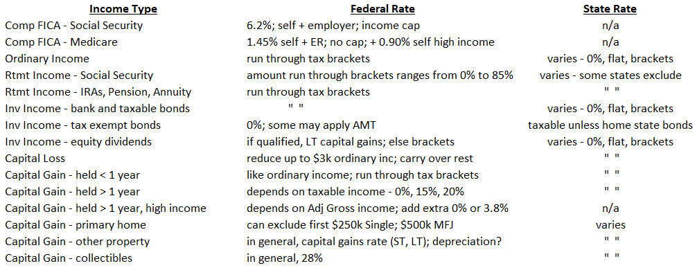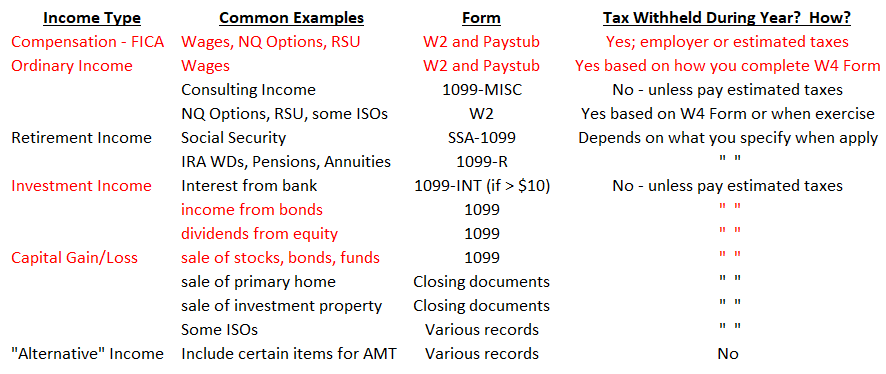 The first thing to understand are the different types of income and gains subject to taxes (see table below).  You will see later that different tax rates can apply and some income amounts you have control over when realized.  For those just starting in the workforce and taking over tax preparation from your parents, focus on the items in red.  I also show the forms that summarizes these amounts; you likely receive in the “important tax document” mail.  Forms are typically received in January or February by the entity holding or disbursing that income type.  The final column shows whether any taxes were likely already withheld and paid during the year.  The key point – you control how much, if any, is withheld (except FICA from employer).  Be aware during the year and adjust accordingly – either by updating the W4 with employer or making estimated tax payments (for example, if large capital gains).