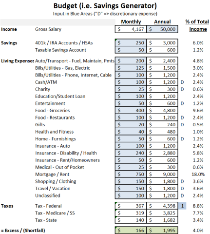 After understanding the common deductions from your paycheck, you may wonder if the net take-home pay will cover your other expenses and if savings should be changed. The best tool to help answer that is a budget. There are convenient tools to track spending but a simple spreadsheet (or pen and paper) will help establish a budget initially to see how to cover expenses and savings. Here is a high-level example. Recall the paycheck deduction example and be sure to start with gross income and include taxes, savings and insurance deductions as part of your budget. And it is important to "pay yourself first." It is intentional that I put the ‘Savings’ category before expenses. As a wise elder would impart whenever he got the chance - “save your money.”